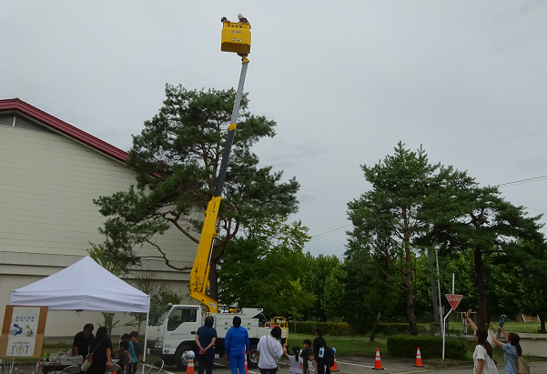 当日は曇り空の中でしたが、予想を超える多くのお子さん達に、高所作業車の乗車体験をしていただき、親子ともども大いに盛り上がりました。
